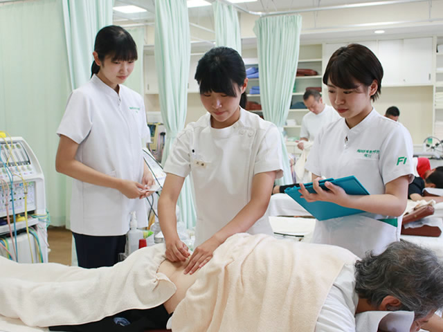 タオルワークや患者への接し方、コミュニケーションの取り方を練習し、附属の鍼灸院を見学します。